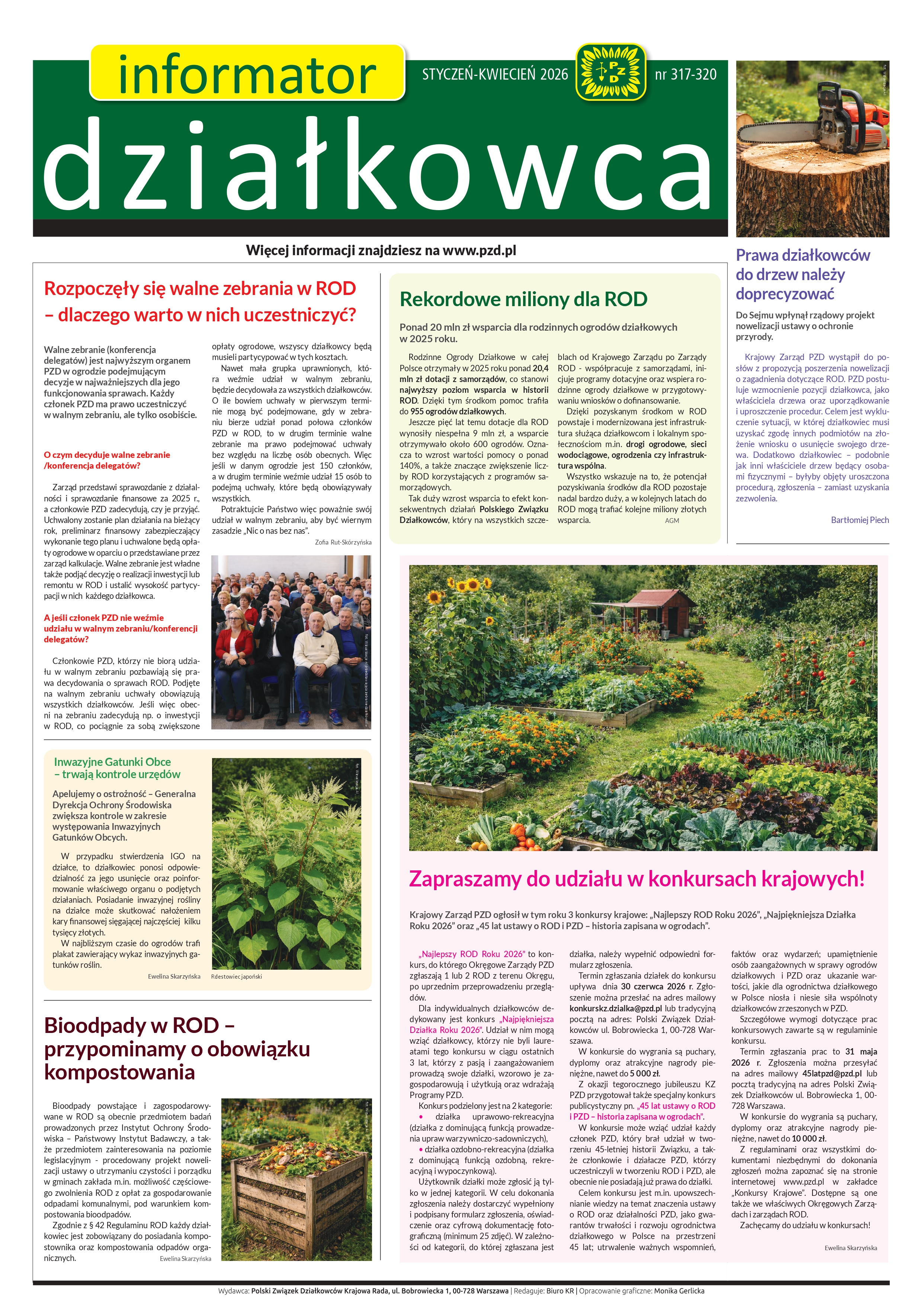 W najnowszym Informatorze „działkowca” m.in. o korzyściach z uczestnictwa w walnym zebraniu w ROD, wsparciu samorządów dla ROD w roku 2025, nowelizacji ustawy o ochronie przyrody, ogłoszonych przez KZ trzech konkursach krajowych, obowiązku kompostowania oraz o prowadzonych przez urzędy kontrolach w sprawie gatunków inwazyjnych na terenie ROD.